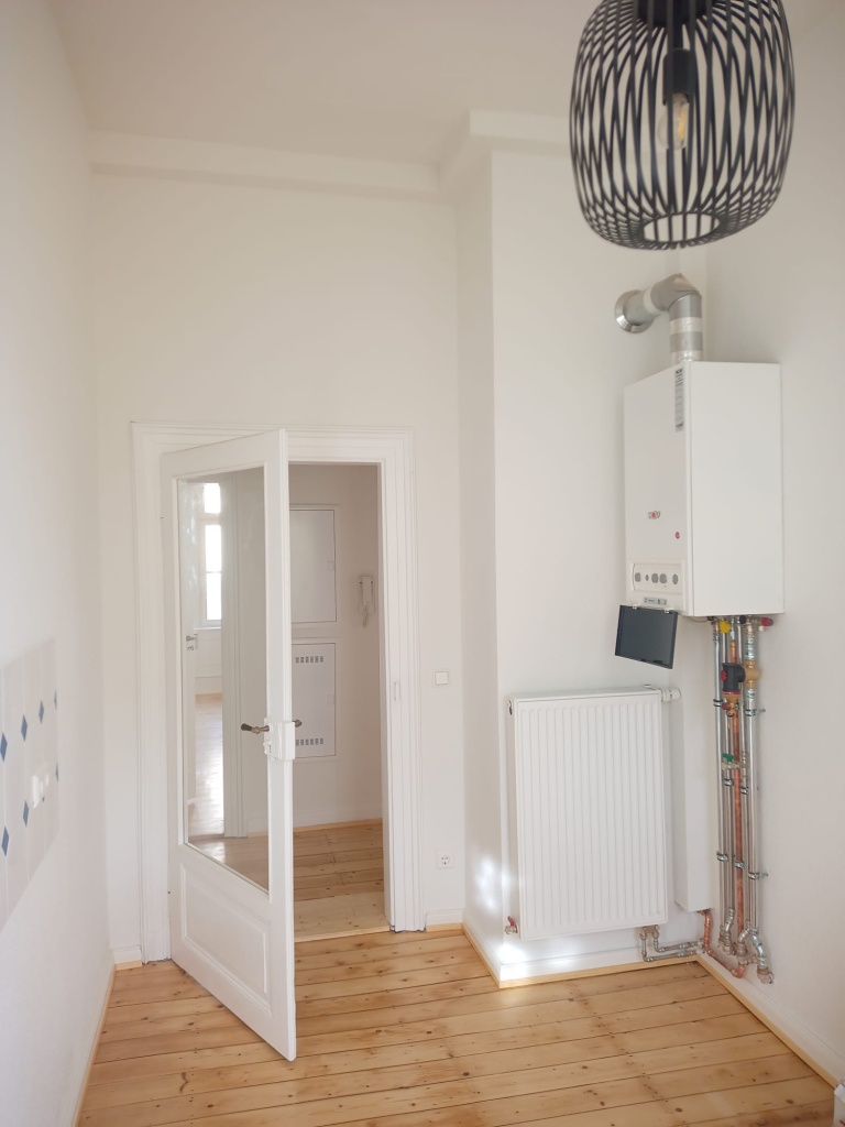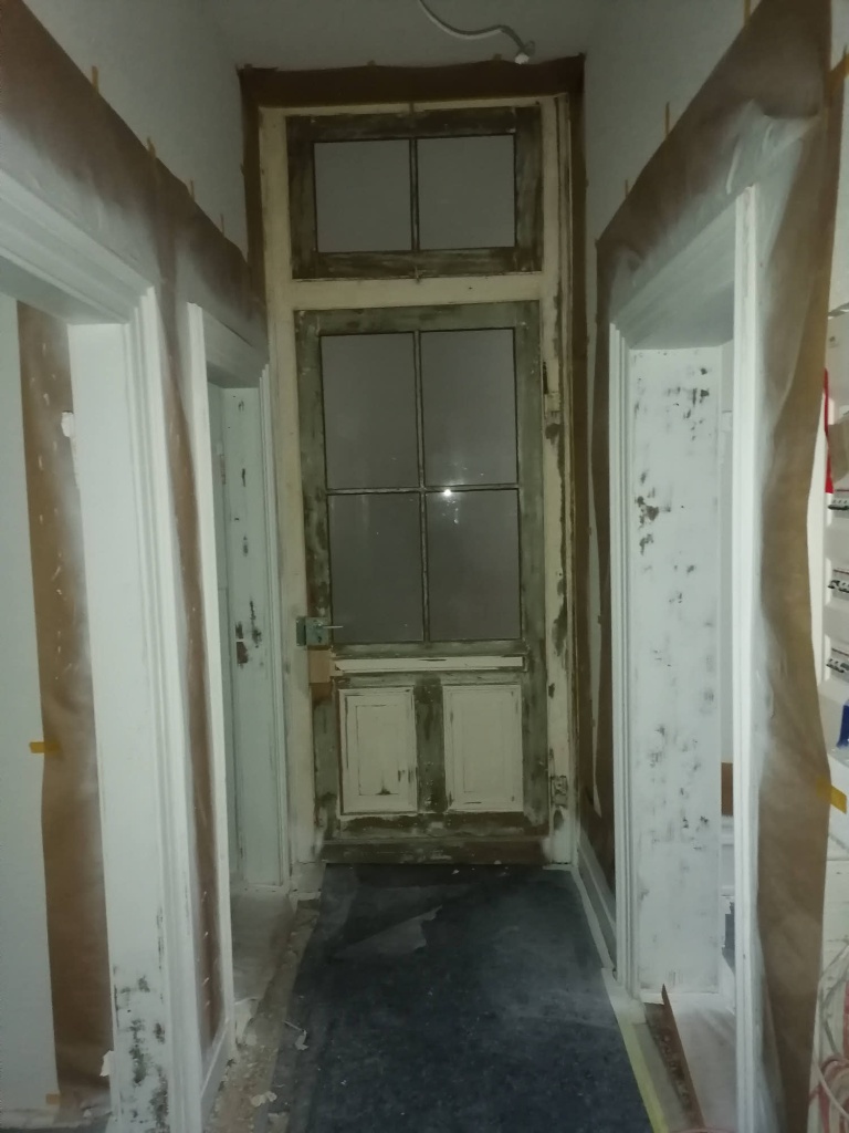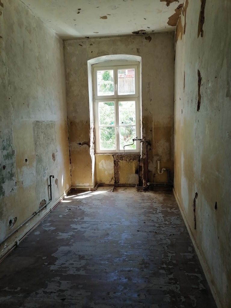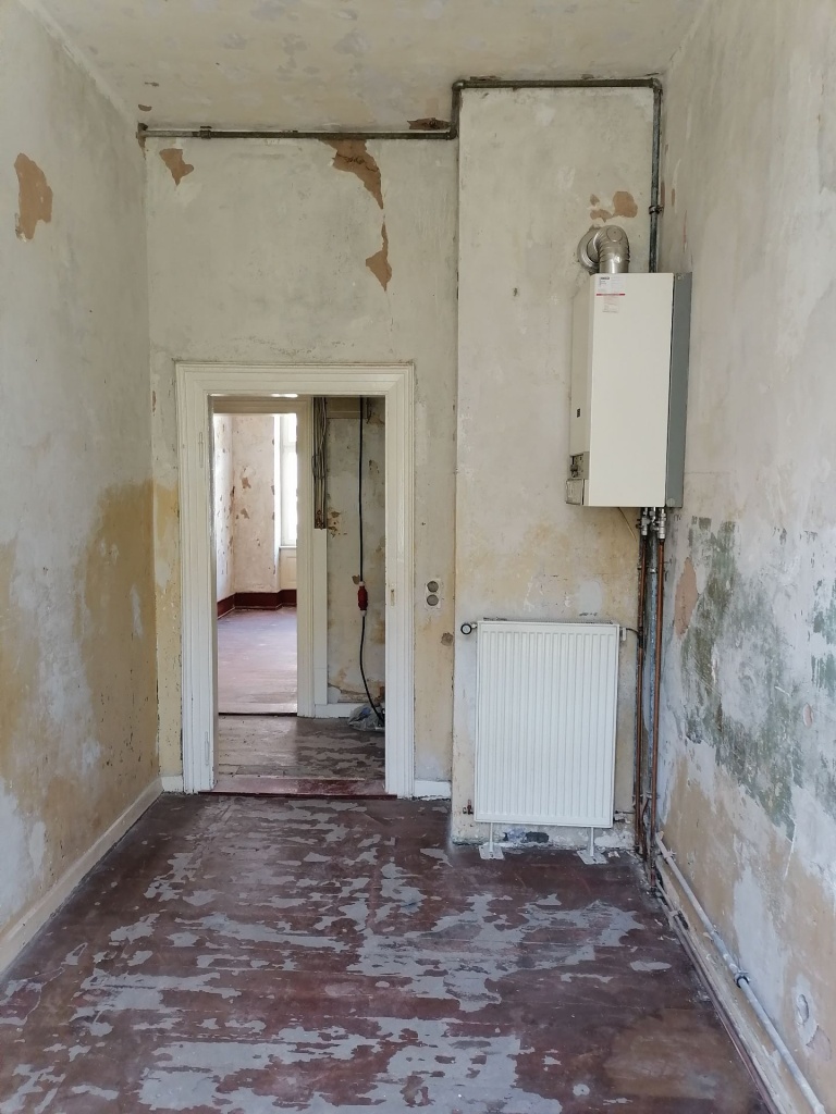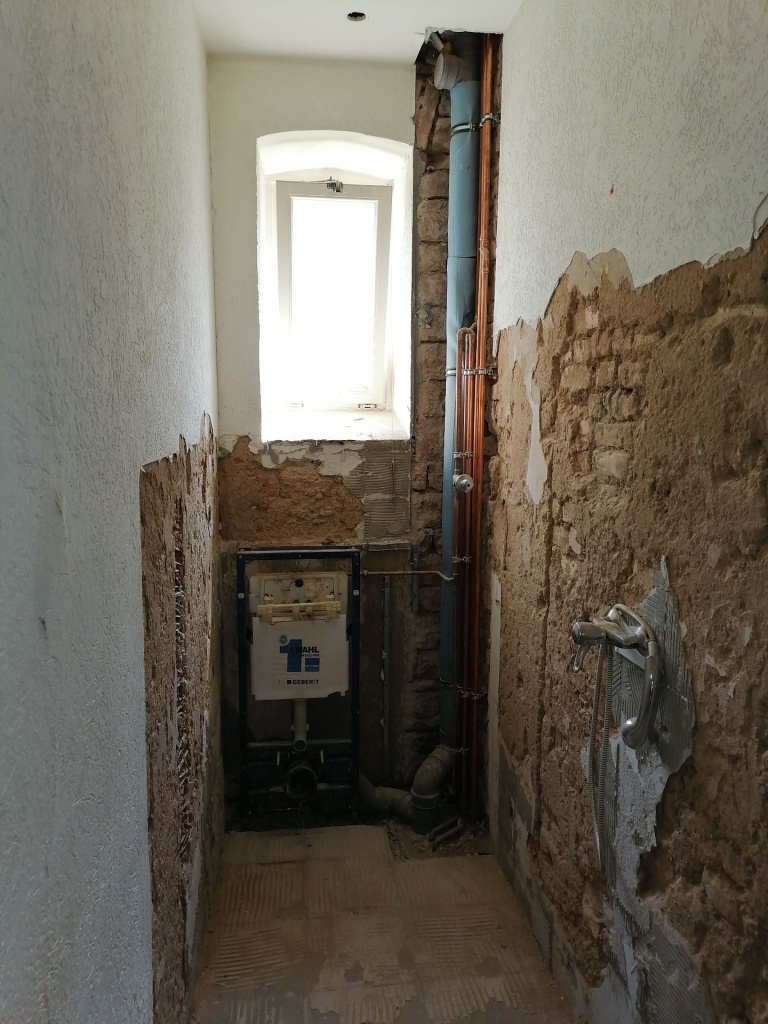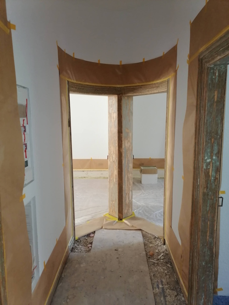 Über einen Zeitraum von fünf Monaten wurden sämtliche Installationen erneuert – darunter Wasser- und Abwasserleitungen, Elektrik sowie Heizungsanschlüsse. Die vorhandenen Türen, Fenster und Böden wurden aufgearbeitet, ergänzt und in ihren ursprünglichen Charakter zurückversetzt. Der alte Dielenboden wurde fachgerecht aufgearbeitet und erhält nun wieder seinen natürlichen Charme. Zusätzlich wurden die Bäder vollständig neu gestaltet und mit modernen Fliesen- und Malerarbeiten versehen, sodass ein harmonisches Zusammenspiel aus Alt und Neu entstanden ist.